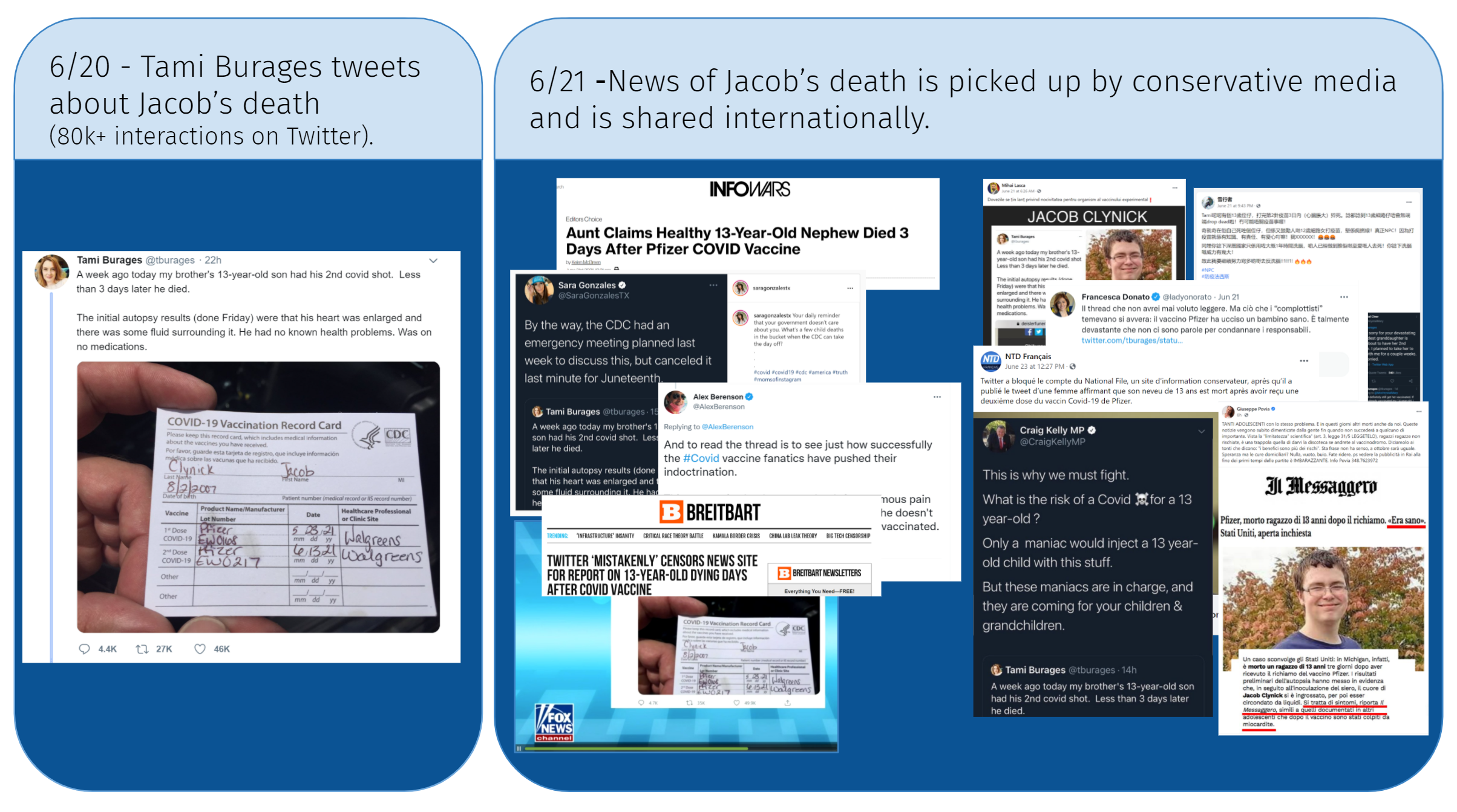 The story of Jacob Clynick, a 13 year-old boy from Michigan who died a few days after his 2nd COVID-19 shot, illustrates how content promoting vaccine hesitancy can go global. On June 20, Jacob’s aunt, Tami Burages, tweeted a thread detailing Jacob’s death, noting that he had no medical conditions and called on the CDC to investigate. While Burages emphasized that she is pro-vaccine, right-wing anti-vaccine communities quickly picked up the story. The following day a TV host for the conservative media outlet, Blaze Media, claimed the CDC had cancelled an emergency meeting to investigate Jacob’s death to celebrate Juneteenth instead. On Instagram, the host reposted the tweet with the caption, “Your daily reminder that your government doesn’t care about you. What’s a few child deaths in the bucket when the CDC can take the day off?” InfoWars, Nationalfile, and Breitbart also circulated the story, as well as anti-vaccine influencer Robert F Kennedy Jr. Burages deleted her original thread, but it appears the thread had been liked over 50,000 times, retweeted over 35,000 times, and received nearly 5,000 comments before it was deleted.