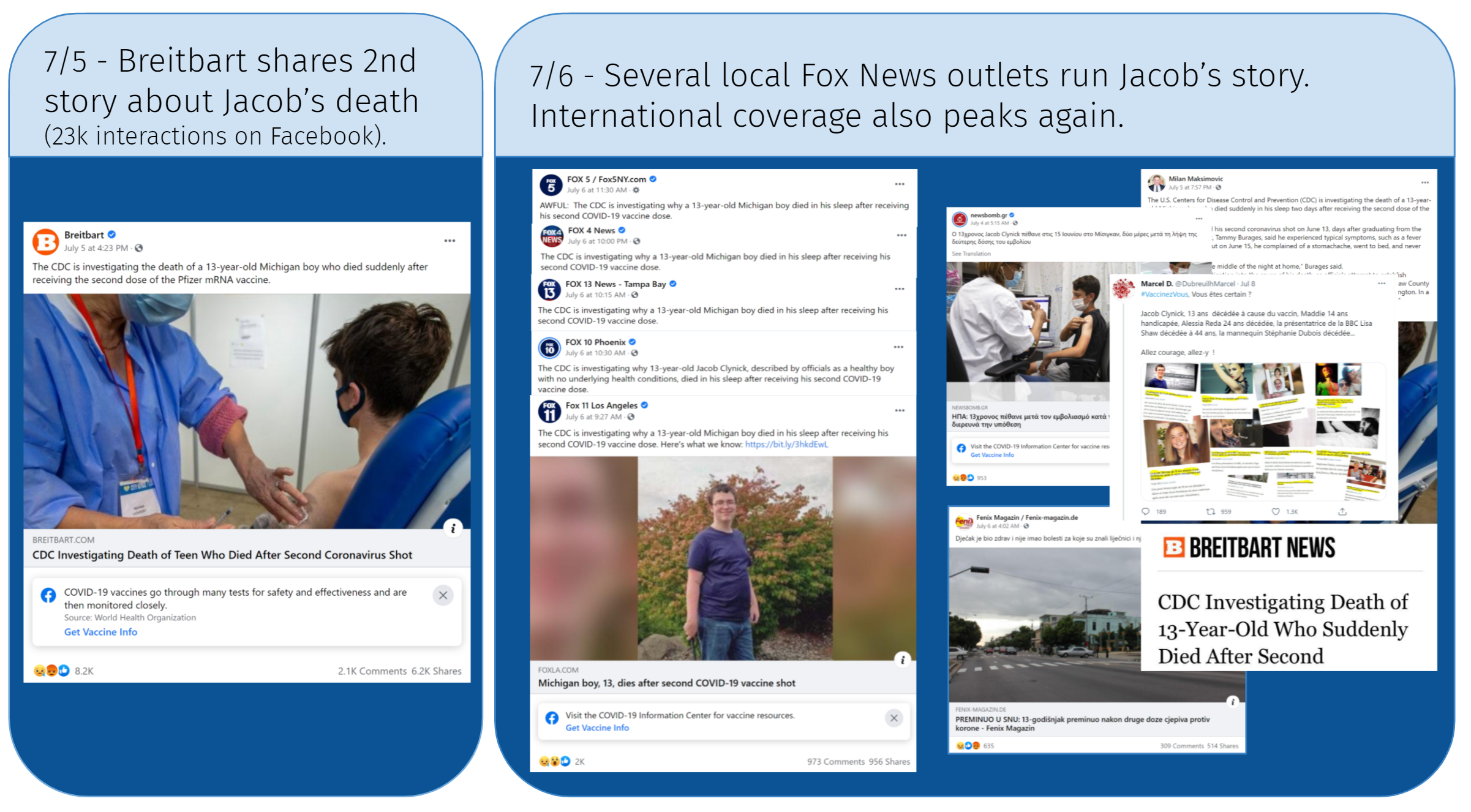 Figure 2: Breitbart shares a second article on Jacob’s death (left). A collage of domestic and international coverage of Jacob’s death the following day (right).
