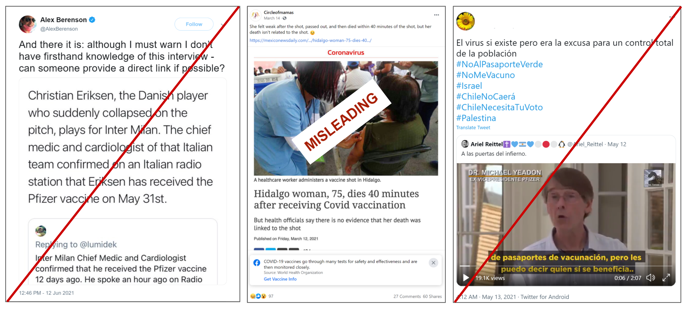 Figure 3: Recurring COVID-19 misinformation spreader Alex Berenson shares a false claim that a Danish soccer player who suffered cardiac arrest had been vaccinated recently (left). A US-based mother’s wellness page shares a story about a Mexican woman who died shortly after receiving the vaccine with the caption, “She felt weak after the shot, passed out, and then died within 40 minutes of the shot, but her death isn't related to the shot. 😒” (center). A Spanish-language account shares criticisms from Michal Yeadon of vaccine passports, with the caption “The virus exists, but it is an excuse for total control of the population” (right, translated).